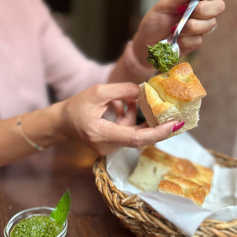 Todo comienza con el couvert – una esponjosa y deliciosa focaccia que llega a la mesa aún caliente. Se unta con pesto genovés, que también se prepara a diario en el restaurante. restaurante a diario.