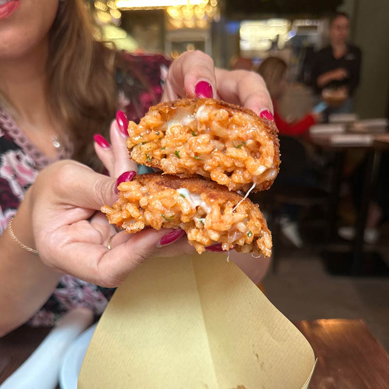 Para empezar, a sugerencia del amable personal, probamos el Cuoppo Napoletano, compuesto por un trío de croquetas italianas: una hecha con patatas y pecorino Romano, la segunda con Romano, la segunda hecha con arroz – arancino – con tomate y mozzarella y la tercera, y favorita de la noche, hecha con arroz – arancino – con tomate y mozzarella. y favorito de la noche, a base de espaguetis con bechamel casera y salami de Nápoles. Salchichón de Nápoles que estaba súper jugoso, recordaba a una carbonara servida en formato croqueta. servido en formato croqueta.