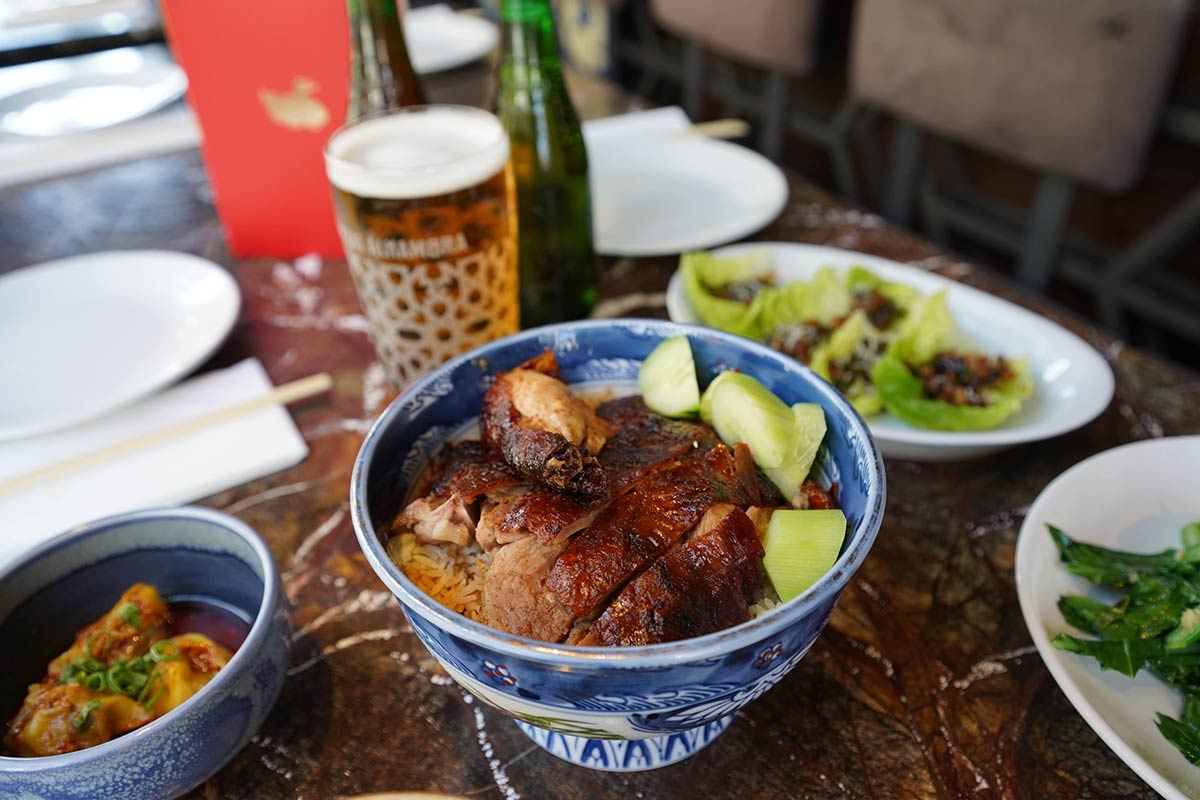 - Pato asado cantonés con arroz jazmín y pepino: Otro plato destacado. El pato estaba crujiente por fuera, tierno por dentro y lleno de ese sabor clásico cantonés.
